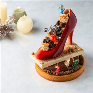 グリオットチェリー入りピスタチオのタルトの上にチョコレートムースをのせて、ハイヒールのチョコレートの中にはクレーム・オ・ブール・キャラメル、ケークショコラ入り。